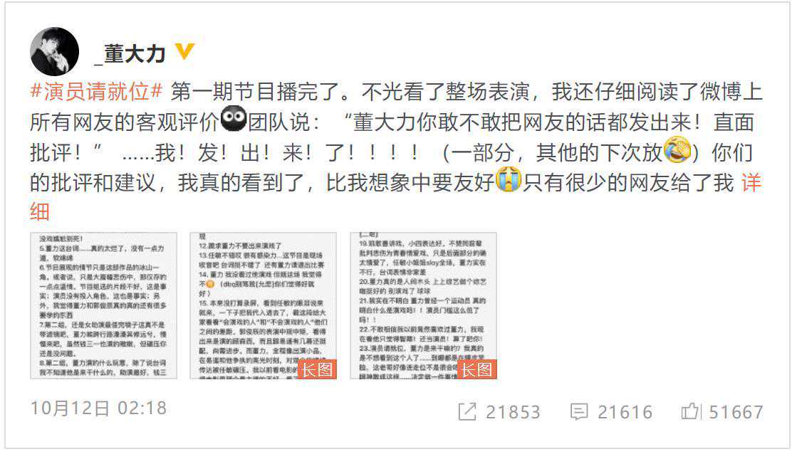 董力和郭俊辰合作,饰演郭敬明作品《悲伤逆流成河》片段,郭俊辰饰演顾森西,董力饰演齐铭,节目一播出,董力的演技就遭到了大规模吐槽,董力很快就发了长文回应,态度还是很诚恳的,把网友们的吐槽观点都列了出来,还反省了自己的不足。