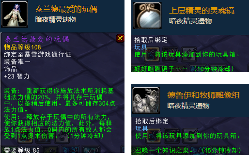 泰兰德最爱的玩偶(饰品)、上层精灵的灵魂镜(玩具)、德鲁伊和牧师雕像组(玩具)